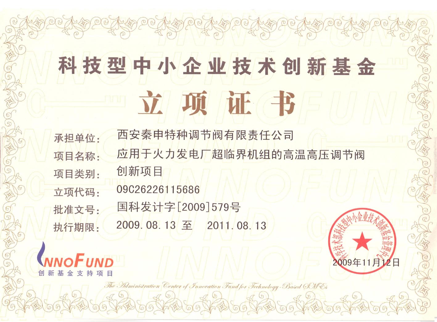 我公司《应用于火电厂超临界机组的高温高压调节阀》项目,于二〇〇九年底荣获国家科技部技术创新基金的重点支持,获得了近百万元资金的无偿资助。