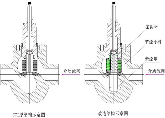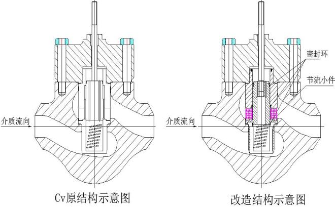 实施过程:原阀门本体、阀盖均不更改,只需要对原来的阀内件进行改造,增加阀门节流等级,采用进口密封环,提高材质硬度等。
